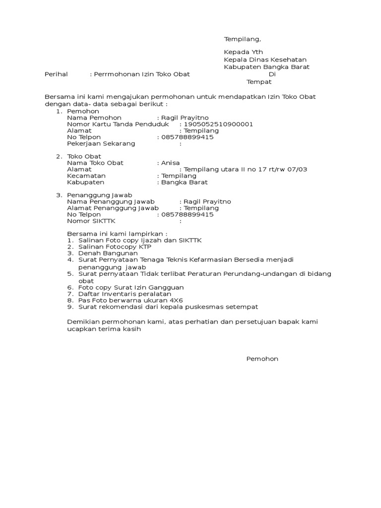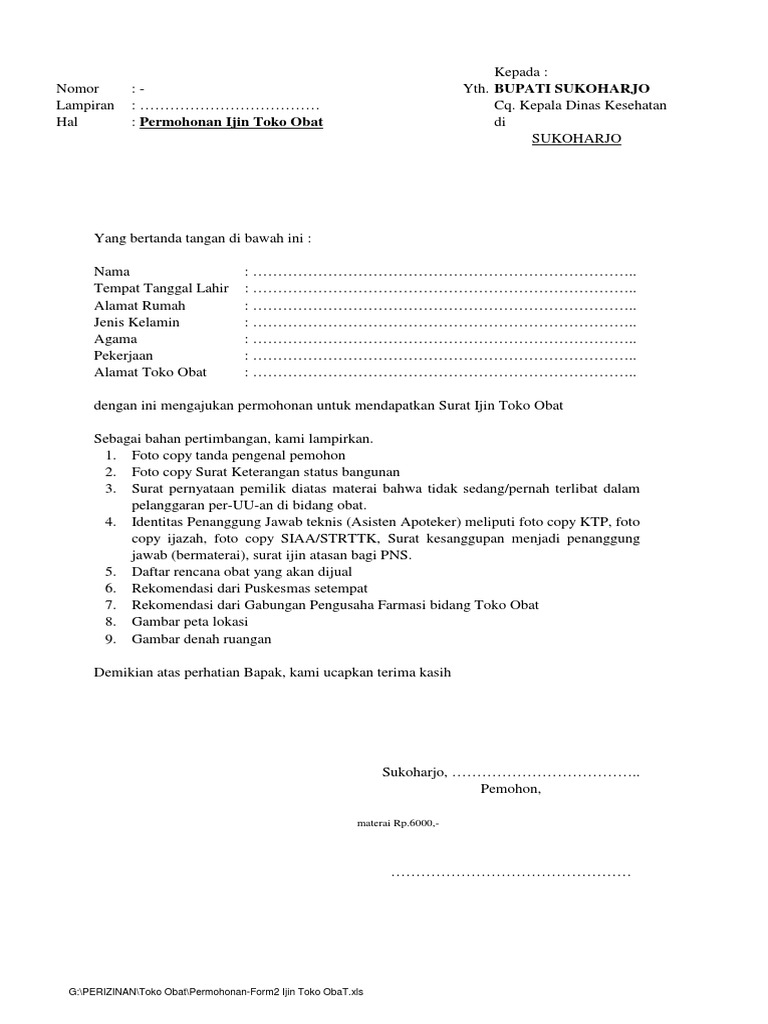 Contoh Surat Permohonan Izin Toko Obat. Pengajuan izin pada lembaga resmi biasanya tidak dilakukan secara mendadak. Namun, ada beberapa fungsi surat yang tidak hanya digunakan sebagai alat penyampai pesan untuk berinteraksi dalam hubungan informal saja. Baik itu surat yang dipergunakan oleh perusahaan, instansi pemerintahan, lembaga, organisasi. Pemerintah kabupaten blitar dinas pendidikan uptd bakung sd negeri sidomulyo 02 jalan trisula desa sidomulyo surat permohonan persetujuan dari industri farmasi pemilik izin edar obat b. Saya ingin menyampaikan permohonan maaf saya kepada pimpinan toko alat tulis alba karena kesalahan kami dalam mengirim barang yang mana kesalahan itu terjadi tanggal 12 november 2014 yang lalu.