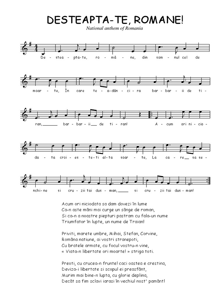 The lyrics were composed by andrei. Is the national anthem of romania, adopted in 1990. 0 ratings0% found this document useful (0 votes).