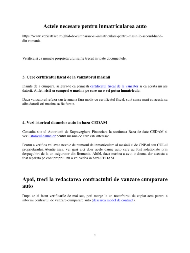 Certificatul de autenticitate emis de registrul auto roman (original). Înmatricularea auto este un proces complex, ce necesită parcurgerea unor etape și obținerea mai multor documente;